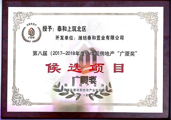 &On June 21, 2018, Weifang Taihe Real Estate Co., Ltd. of the group, after more than ten years of elaborately building a classic project in the north area of Taihe, won the honor of the eighth (2017-2018) China real estate "Guangsha Award" candidate project. &Nbsp; & nbsp; "Guangsha Award" is a comprehensive real estate award approved by the Ministry of housing and urban rural development of the State Council and jointly established by the China Real Estate Association and the housing industrialization promotion center of the Ministry of housing and urban rural development. It is the most authoritative national real estate award in the industry in China. Like the "Luban Award", it represents the highest honor of the real estate industry. The Guangsha award was first established in 2006, every two years, and this year is the eighth. &The award-winning project of "Guangsha Award" must be aimed at building a resource-saving and environment-friendly socialist harmonious society and ecological civilization, with high planning and design level, good environmental quality and excellent project quality, which can play a leading role in promoting housing industrialization, "four festivals and one environmental protection" and solving the housing problems of the masses. &The selection of "Guangsha Award" follows the principle of "openness, fairness, justice and public welfare" from the bottom to the top. It needs to be selected and strictly checked by municipal, provincial and national three-level selection agencies, with strict evaluation procedures, full sunshine operation and social supervision. People's satisfaction is one of the important indicators of evaluation, and one vote veto is implemented. The final award-winning projects have great influence and high quality in the industry and buyers. &When the project of Taihe shangzhubei district has not officially entered the market, it has been widely concerned and warmly sought after by Weifang citizens. This is also the trust and recognition of our Changda real estate. Thailand and the company will develop, build and operate this boutique project in a responsible attitude towards the city, history and owners.