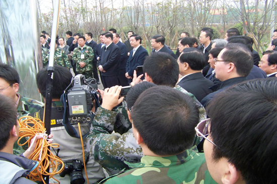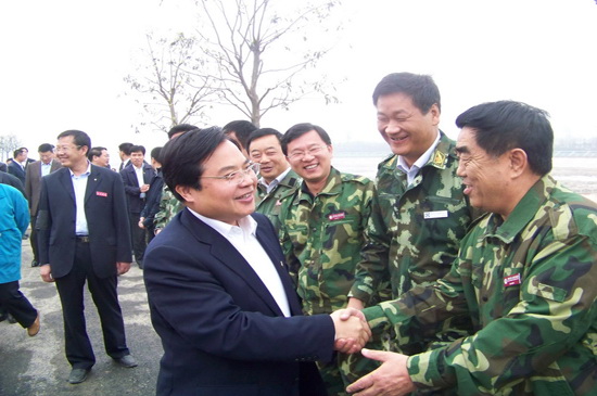 4月10日上午,山東省黨政代表團(tuán)在省委書記姜異康、省長(zhǎng)姜大明率領(lǐng)下,到北川新縣城檢查指導(dǎo)援建工作,山東省十七地市黨政負(fù)責(zé)人參加檢查。徐鵬強(qiáng)董事長(zhǎng)在集團(tuán)公司援建的安昌河堤頂?shù)缆飞嫌訖z查團(tuán)并陪同檢查。