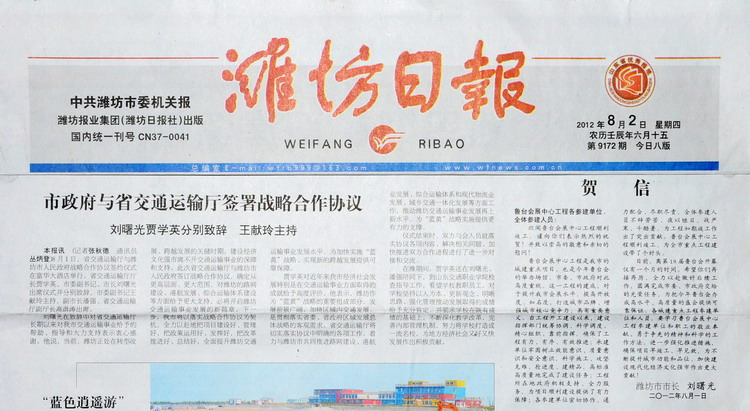 濰坊市市長劉曙光給魯臺(tái)會(huì)展中心工程各參建單位、全體參建人員的賀信在濰坊日報(bào)2012年8月