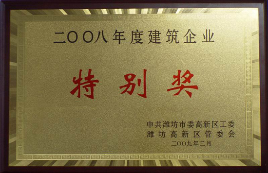 集團公司被高新區(qū)黨工委、管委會 授予二〇〇八年度建筑企業(yè)特別獎 (09.02.20)