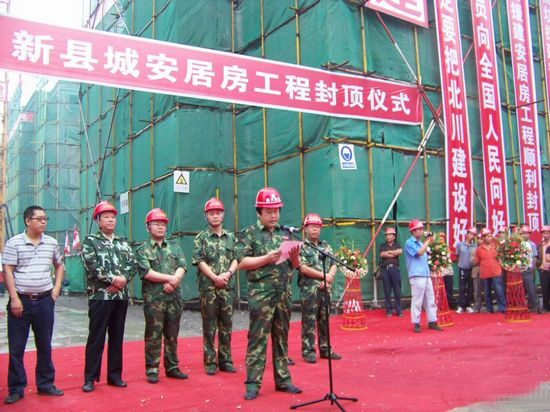 9月25日上午11時20分,山東省援建新北川安居房工程舉行隆重的封頂儀式,儀式地點就設(shè)在集團公司承建的工程施工現(xiàn)場。中央電視臺新聞頻道在中午11時至12時的新聞直播段進行了現(xiàn)場插播報道,“昌大建設(shè)”字號和援川人員多次在畫面中出現(xiàn)。集團公司總經(jīng)理朱九洲參加了今天的封頂儀式并講話。今天封頂儀式現(xiàn)場下著大雨,援川人員在雨中舉行了這一慶奠。 根據(jù)指揮部的消息,第八分公司承擔的六棟安居房已于昨天(24日)全部封頂。