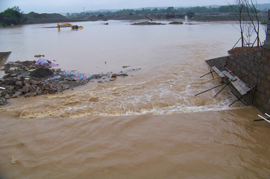 7月24日至25日,一場特大暴雨突襲北川新縣城,集團公司援建的多處工地受到影響。至25日凌晨,職工宿舍、辦公室、食堂等地方進水高達40cm,集團公司的援川人員,特別是第八分公司的員工及時展開自救。幾個小時內(nèi),大家先后將室內(nèi)的物品轉(zhuǎn)移到高處沒有進水的房間,天一亮,指揮部便緊急組織工地搶險,大家分工協(xié)同,分別趕赴安昌河下游施工段和安昌河已驗收河段查看受災(zāi)情況……由于指揮部早在20日就下達安昌河防防汛通知,各施工單位提前應(yīng)對,從而保證在這次特大洪水來臨時,所有施工人員安全撤離、所有材料轉(zhuǎn)移(由于汛情超過預(yù)想,第八分公司安昌河下游施工段景觀濕地形成了大面積積水致使一些土方機械過水)。此次洪水來襲,已竣工的安昌河段安然無恙,第八分公司正在施工的安昌河下游溢流堰、擋水堰已經(jīng)合攏,經(jīng)受住了洪水沖擊。 ![]() 洪水中的施工現(xiàn)場