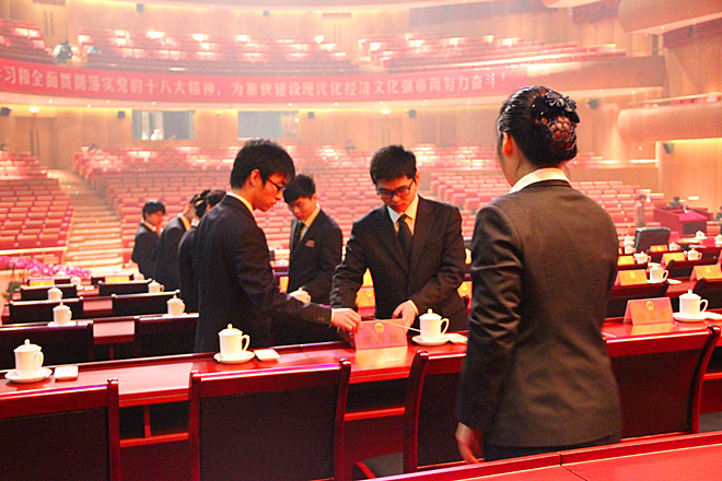 由于本次會議市政府要求不安排專業(yè)禮儀公司承接,這樣會務(wù)的服務(wù)接待任務(wù)也全部落在了公管公司。為做好會議接待服務(wù)工作,從2012年12月中旬開始,公管公司挑選了35名人員并聘請專業(yè)講師進行培訓。除此之外,公管公司執(zhí)行董事李坤明親率公管公司領(lǐng)導班子成員和員工全面投入會務(wù)保障工作。會務(wù)期間,投入保潔75人,保安42人,接待35人,消防18人,電力保證12人,物資保障20人,制作安裝宣傳標語和引導牌200多塊,擺放花卉200多盆,鋪設(shè)地毯3341 平方米,調(diào)用桌子180張,椅子250把,沙發(fā)15套,各類會議用品30多個品種。全面、高效、順利完成了對本次會議的保障工作。