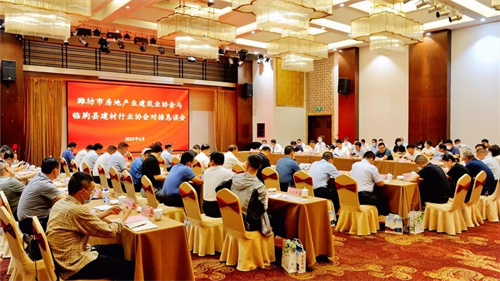 2022年6月11日,濰坊市房地產(chǎn)業(yè)協(xié)會(huì)、濰坊市建筑業(yè)協(xié)會(huì)與臨朐縣建材行業(yè)協(xié)會(huì)對(duì)接懇談會(huì)在臨朐縣攬翠湖酒店舉行。濰坊市建筑業(yè)發(fā)展服務(wù)中心副主任丁士剛,濰坊市房地產(chǎn)業(yè)協(xié)會(huì)會(huì)長(zhǎng)、集團(tuán)董事長(zhǎng)徐鵬強(qiáng),濰坊市建筑業(yè)協(xié)會(huì)會(huì)長(zhǎng)、集團(tuán)總工程師房海,臨朐縣委副書(shū)記、縣長(zhǎng)陳誠(chéng),縣委常委、辦公室主任王磊,副縣長(zhǎng)董樹(shù)華,市房協(xié)副會(huì)長(zhǎng)單位和市建協(xié)副會(huì)長(zhǎng)單位20余位負(fù)責(zé)人,臨朐縣相關(guān)部門(mén)負(fù)責(zé)人出席對(duì)接懇談會(huì)。
