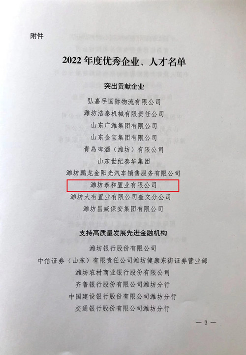新元肇啟,萬事可期。2023年1月29日,奎文區(qū)高質(zhì)量發(fā)展動員大會在區(qū)機關(guān)綜合服務(wù)中心召開。區(qū)委書記周俊出席會議并講話,區(qū)長劉建安主持會議,區(qū)委副書記李慶華宣讀表揚通報,集團所屬濰坊泰和置業(yè)有限公司被評為奎文區(qū)“2022年度突出貢獻企業(yè)”。每一項榮譽的背后,既是奎文區(qū)委、區(qū)政府和各級單位對集團以及泰和置業(yè)公司的支持與認可,也是昌大地產(chǎn)人對初心的堅守與踐行。春回大地萬象新,砥礪奮進正當時。2023年,泰和置業(yè)將以此為鞭策和鼓舞,勠力同心、再接再厲,以不懈奮斗者的姿態(tài)、以永作追夢人的果敢,發(fā)奮“兔”強,“兔”飛猛進!