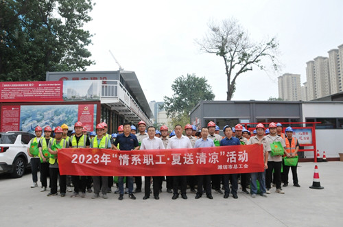 2023年7月12日上午,濰坊市總工會副主席朱建平到集團(tuán)總承包施工的市重點(diǎn)項(xiàng)目濰坊市人民醫(yī)院項(xiàng)目現(xiàn)場進(jìn)行了“情系職工?夏送清涼”走訪慰問活動(dòng),向廣大一線建設(shè)者表示慰問,并為一建公司、四建公司一線職工發(fā)放清涼物資包(天堂折疊傘、日照綠茶、六神花露水、奇強(qiáng)洗衣粉、舒蕾沐浴露、潔玉毛巾等)。