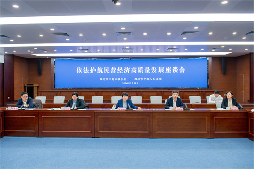2024年2月29日上午,濰坊市依法護(hù)航民營經(jīng)濟(jì)高質(zhì)量發(fā)展座談會在濰坊市中級人民法院會議室召開。市政府副市長、市工商聯(lián)主席陳端梅,市委統(tǒng)戰(zhàn)部副部長、市工商聯(lián)黨組書記劉興成,市工商聯(lián)黨組成員副主席譚述霞出席會議。市委政法委、市工商聯(lián)相關(guān)工作人員,商會會長代表、企業(yè)家代表、民營企業(yè)法務(wù)中心代表參加會議。集團(tuán)公司總裁朱九洲出席會議并作交流發(fā)言,代表企業(yè)家感謝市中院及法院系統(tǒng)在依法護(hù)航企業(yè)發(fā)展過程中給予的支持,同時(shí)建議法院系統(tǒng)繼續(xù)依法對民營企業(yè)提供法律保護(hù)等。
