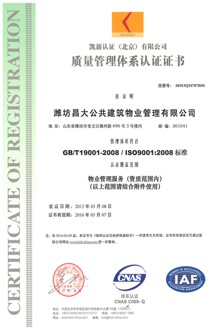 近日,集團(tuán)公管公司(濰坊昌大公共建筑物業(yè)管理有限公司)通過ISO9001質(zhì)量管理認(rèn)證。ISO9001質(zhì)量管理認(rèn)證的取得和實(shí)施,對于公管公司提高物業(yè)管理水平,擴(kuò)大企業(yè)知名度,增強(qiáng)企業(yè)競爭力都有約束和推動(dòng)作用。