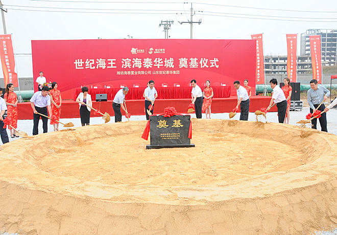 2013年6月1日上午,由濱海區(qū)管委會組織的濱海泰華城、世紀海王項目奠基儀式在濱海區(qū)府前街與海港路交匯處東北角隆重舉行,集團公司總經理朱九洲出席奠基儀式并與主席臺領導一同為項目培土奠基。出席儀式的領導還有濰坊市副市長、濱海區(qū)黨工委書記王樹華,濱海區(qū)黨工委副書記、管委會主任張恒道,濱海區(qū)管委會副主任王希光,建設銀行濰坊分行行長陳鵬,浦發(fā)銀行濰坊分行副行長劉兆建,山東世紀泰華集團董事長劉云江,山東海王集團黨委副書記、副總經理崔秀勝等。集團公司第二分公司領導班子成員及員工代表,濱海區(qū)黨工委和管委會有關人員、項目所在地有關部門負責人參加了上述活動。
